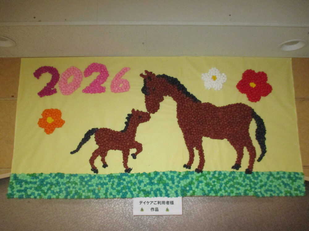 玄関エントランスの利用者様の作品を張り替えています。今年は午年です!